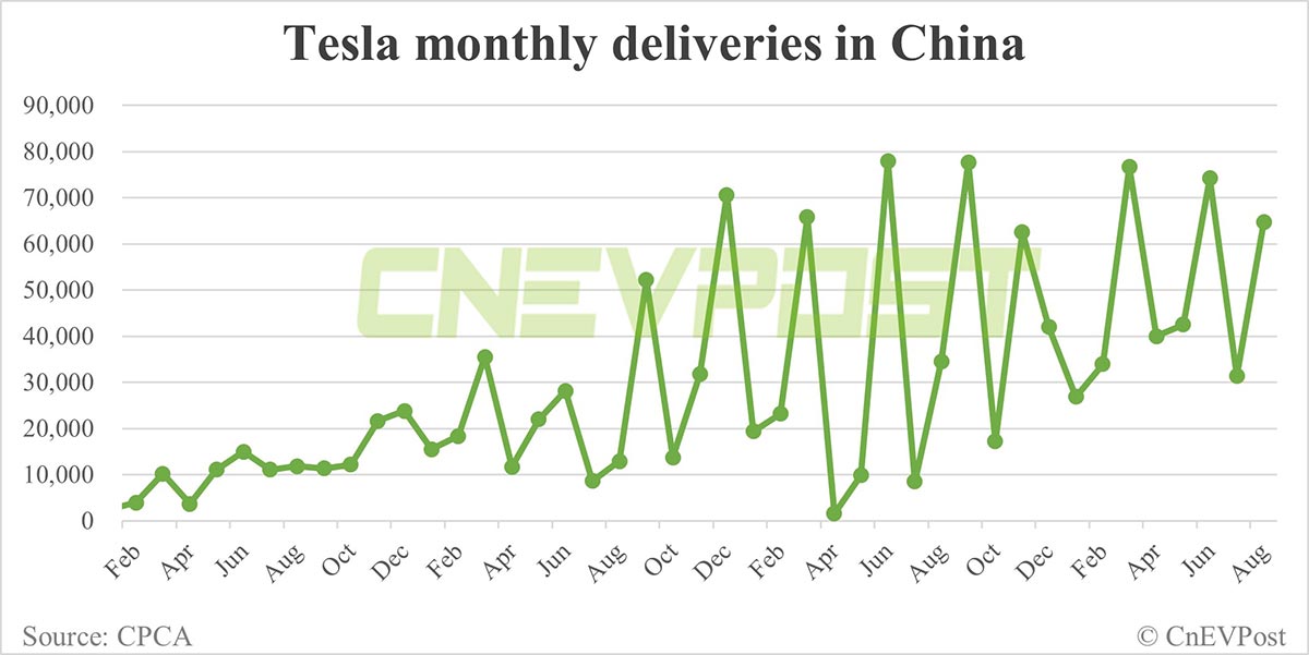 The latest figures from the CPCA mean that Tesla delivered 64,694 vehicles in China in August, up 87.51 percent year-on-year and up 105.88 percent from July.